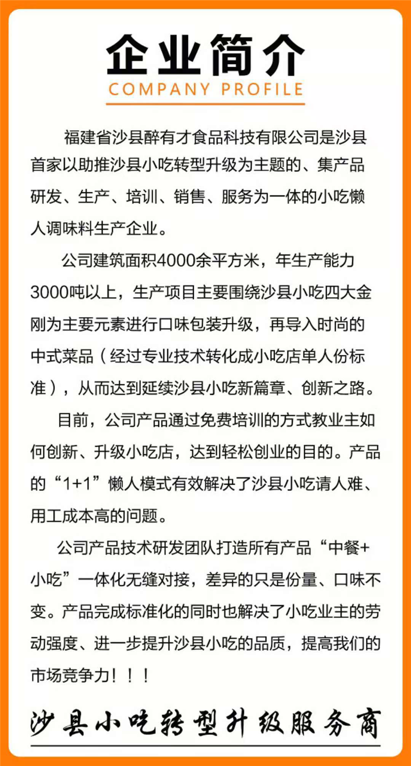 沙县醉有才食品科技有限公司是沙县首家以助推沙县小吃转型升级为主题的、集产品研发、生产、培训、销售、服务为一体的小吃懒人调味料生产企业,目前已自主研发酱料40多款。UED体育(中国)与醉有才公司本着优势互补、资源共享、共同发展的原则,以传承、创新“沙县小吃”技艺和推进“沙县小吃”转型升级为目标,从技术研发和培训推广两个方面对接合作。