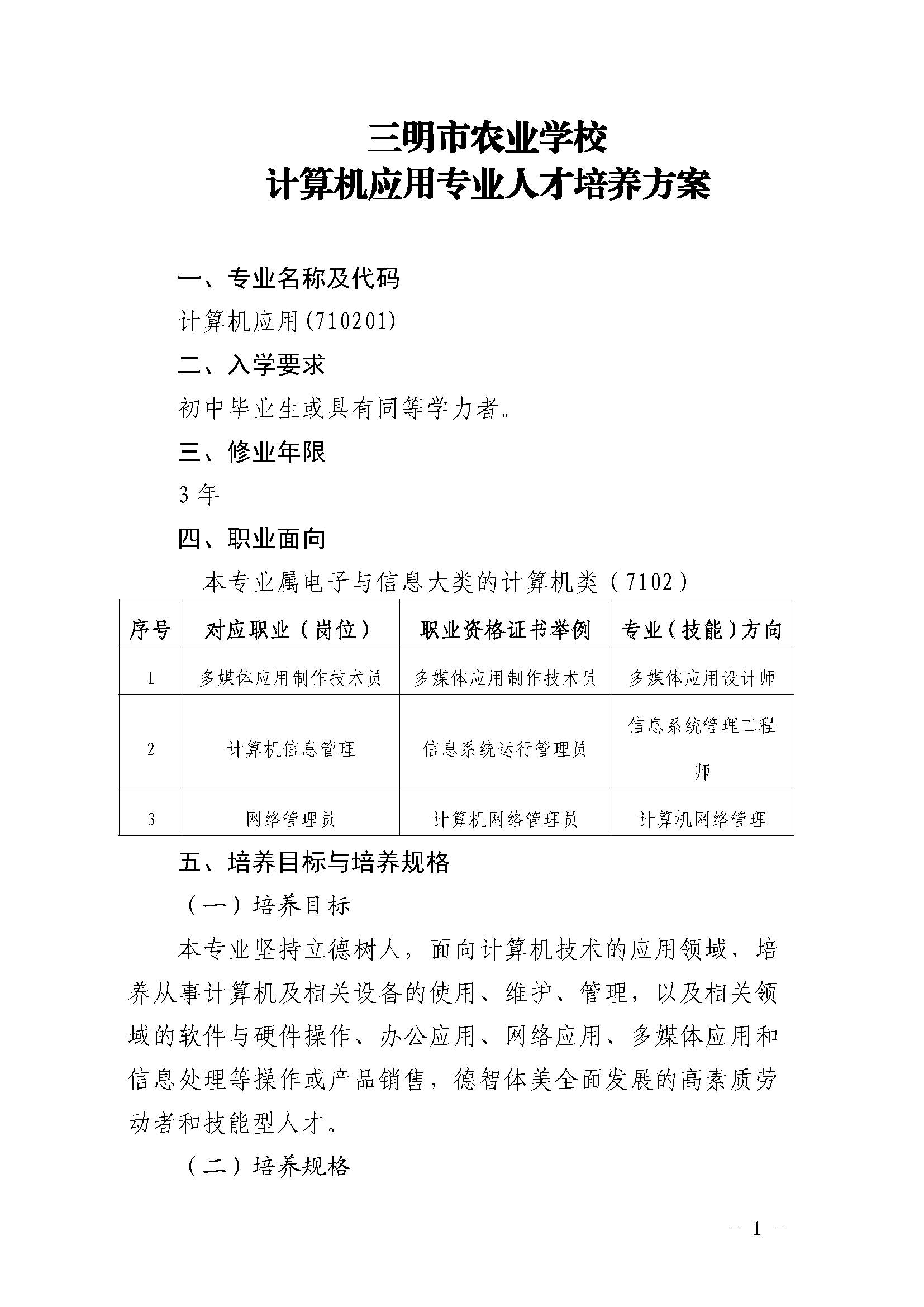 三明市农业学校计算机应用专业人才培养方案(2023)